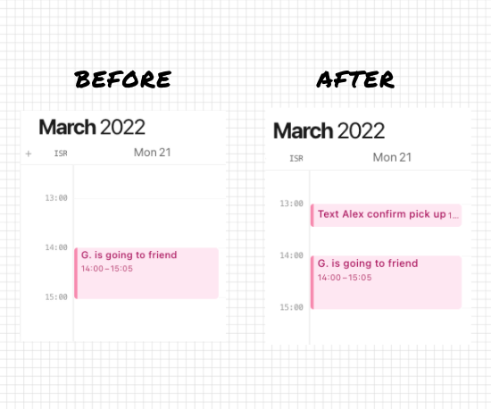 In the review I'll see that on Monday after school my son is going on a playdate at a friend, I'll add an event to confirm with the friend's parents they're picking him up. (Had a mishap with a parent that was supposed to pick him up, but forgot to tell me they aren't... Had to rush quickly to school, luckily got there on time, not letting this happen again...).