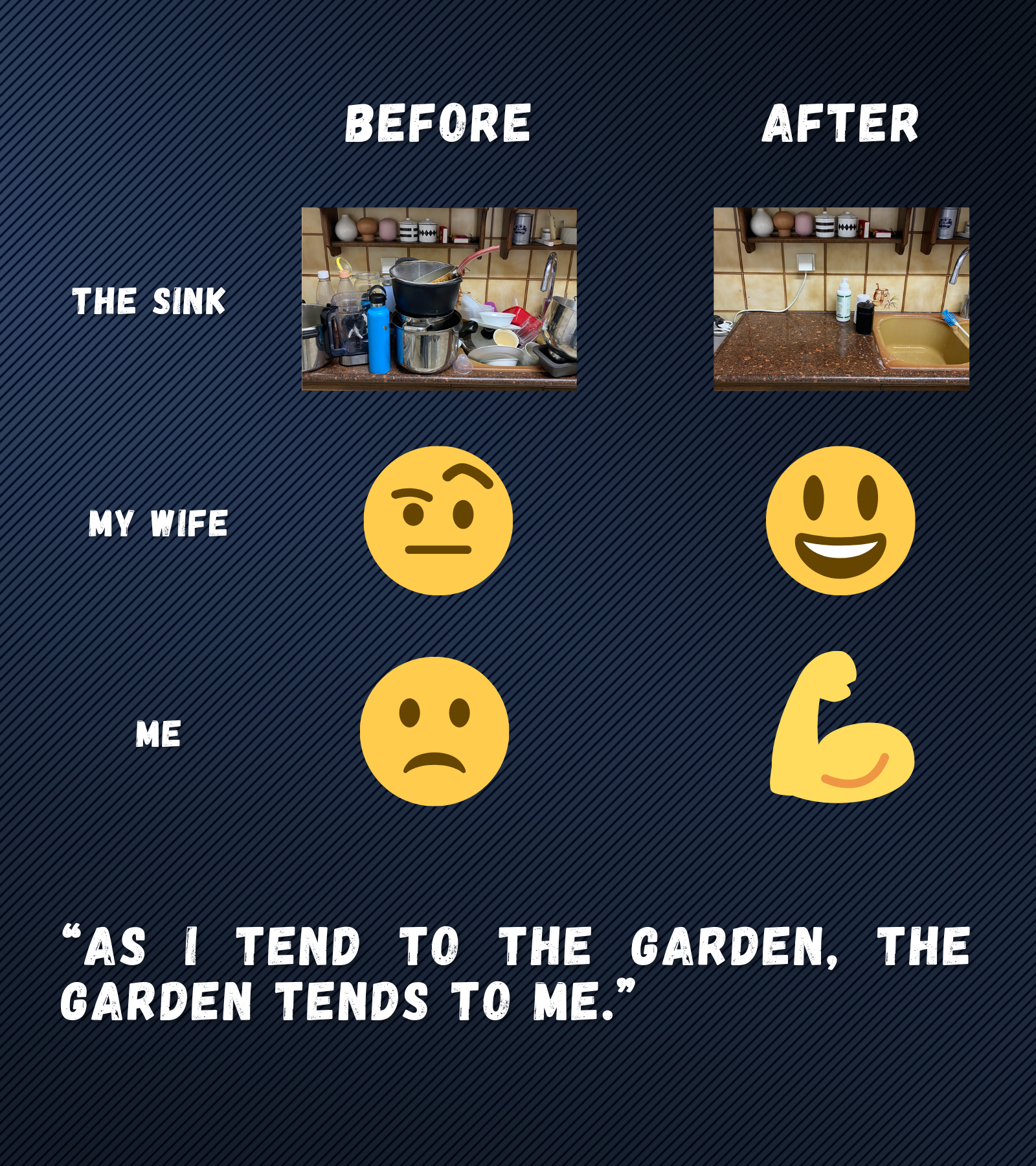 Now seeing a sink full of dishes makes me happy, it’s an opportunity for me to return some order into the world. To fight entropy.